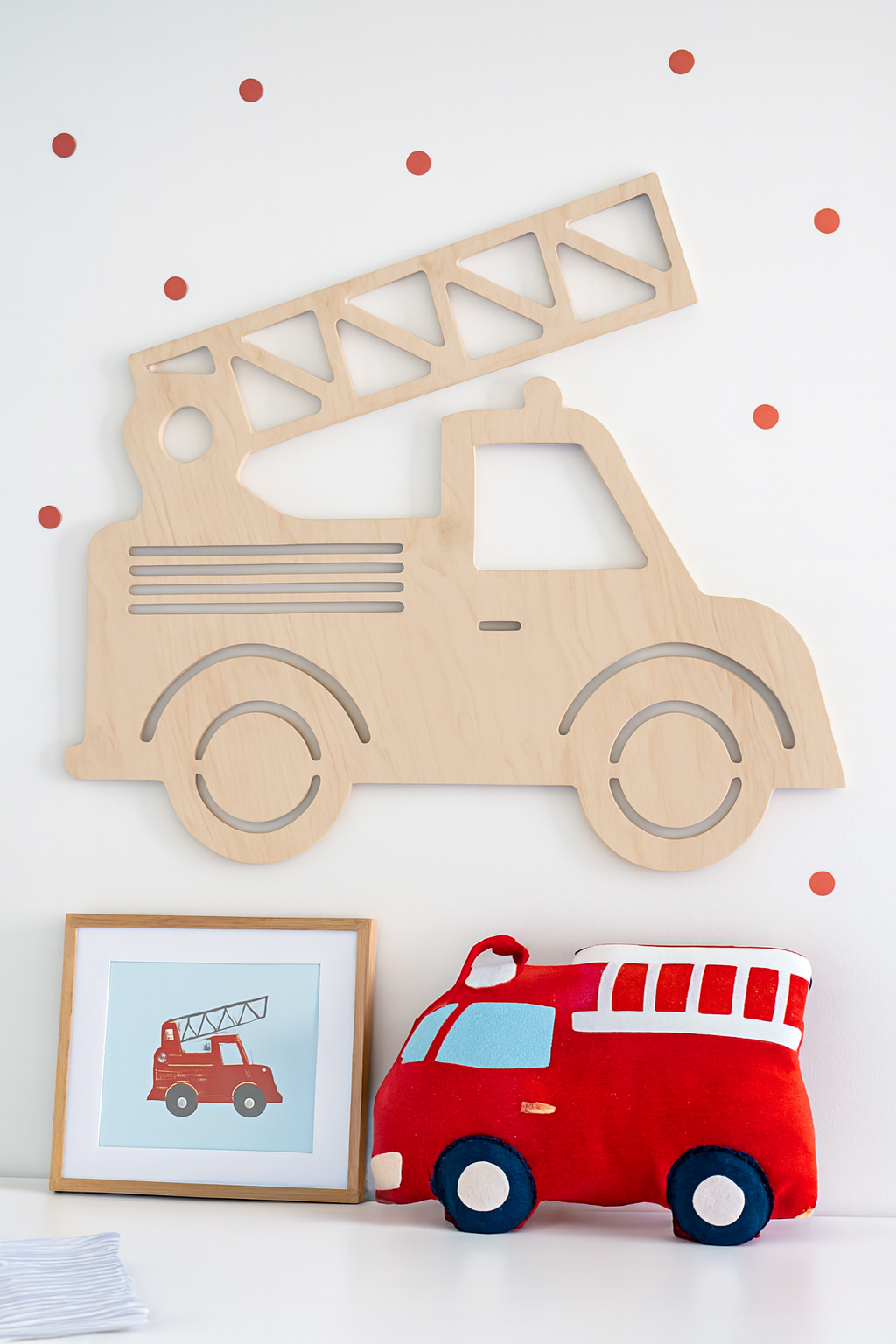"Breng wat actie naar je muur met deze houten wanddecoratie in de vorm van een brandweerwagen! Perfect voor kleine brandweerlieden in spe, of gewoon voor iedereen die vindt dat hun interieur wel wat meer vuur kan gebruiken. Deze stoere brandweerwagen staat altijd paraat om je muur van saaie situaties te redden. Hang hem op, en het enige wat nog ontbreekt is een sirene die 'tuuut tuuut' loeit!